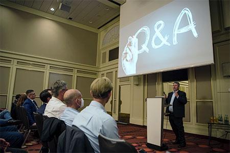 In diesem Jahr durften wir Herrn Dr. Roland Schütz, CIO der PHOENIX group, zum ersten Mal bei uns begrüßen. In seinem Vortrag warf er einen Blick zurück und einen in die Zukunft und stellte dabei unter anderem die aktuellen Projekte der PHOENIX vor. Auch die Herren Geschäftsführer der ADG, Joachim von Morstein, Bernd Hess und Dr. Max Schwesig informierten über das laufende Geschäftsjahr im In- und Ausland und gaben einen Ausblick auf anstehende Herausforderungen.